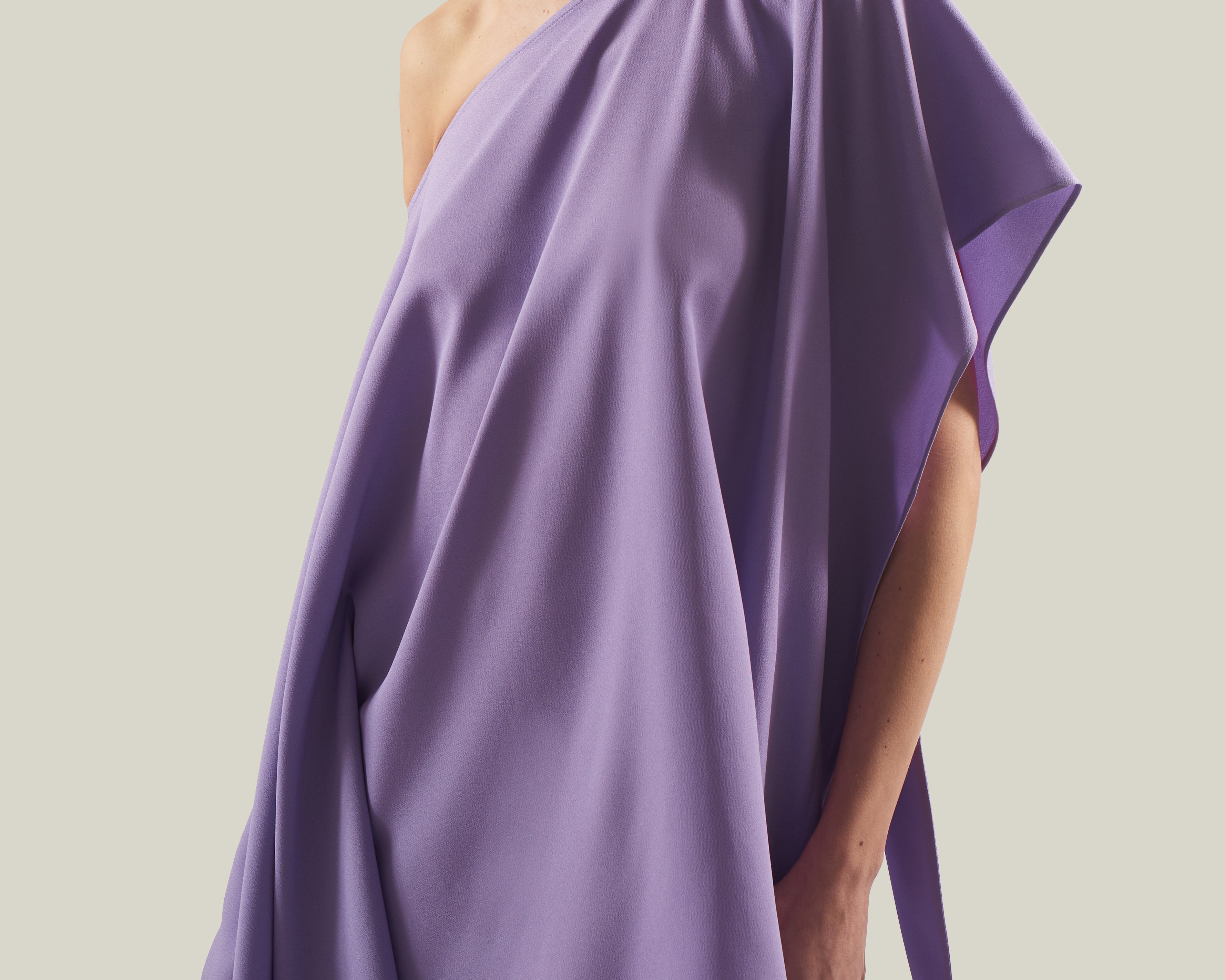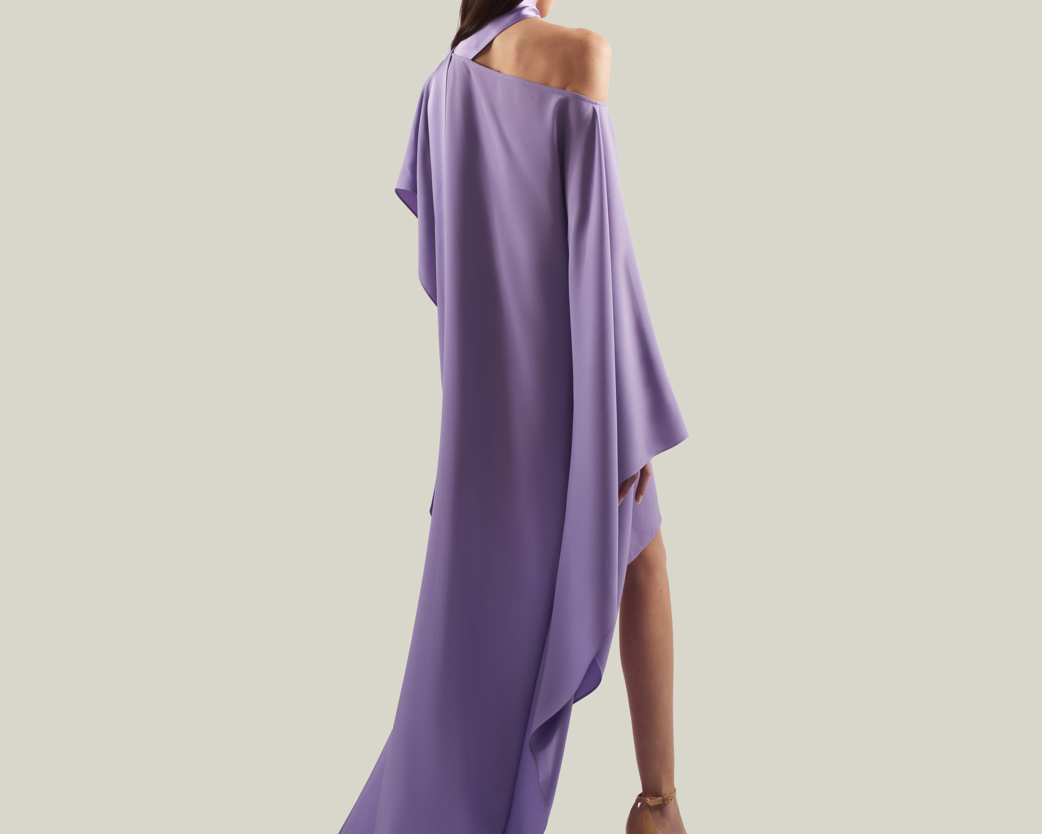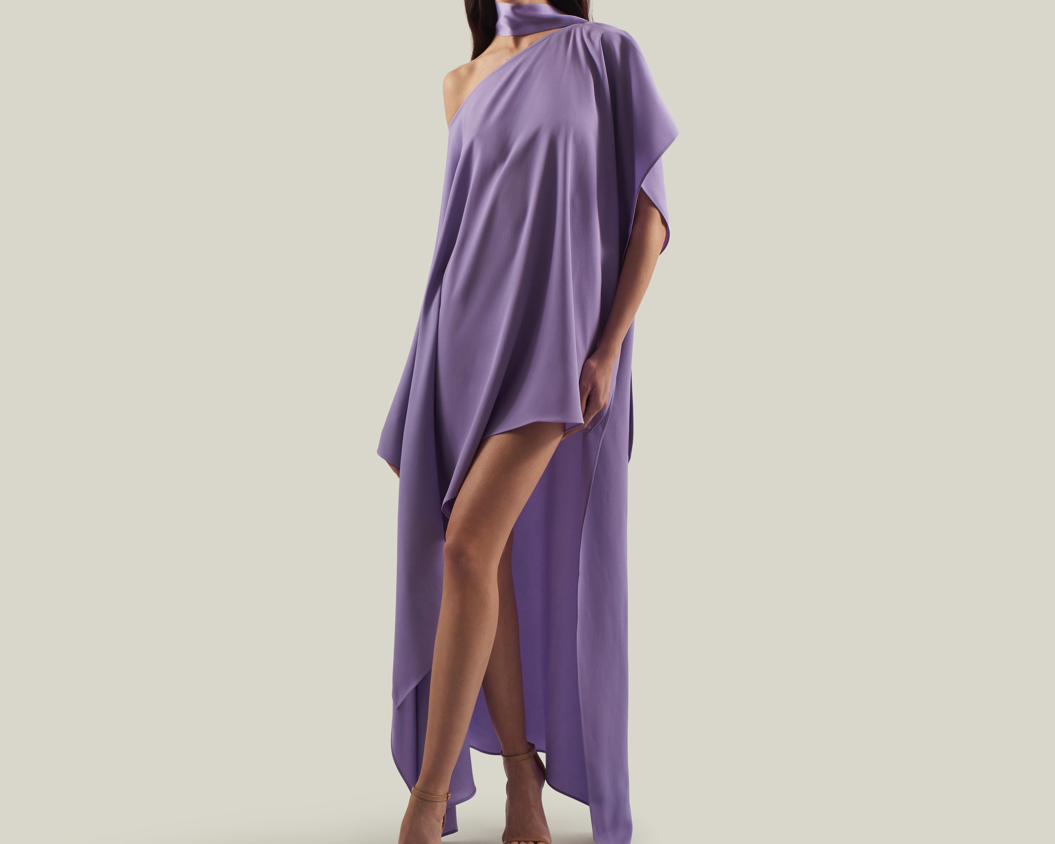 The Trebbia Kaftan is made for sun lovers. It is a one-shoulder deconstructed asymmetrical kaftan made from soft viscose-blend crepe cady. An attached scarf finishes the neckline, giving movement and a laid-back attitude to the garment.