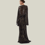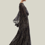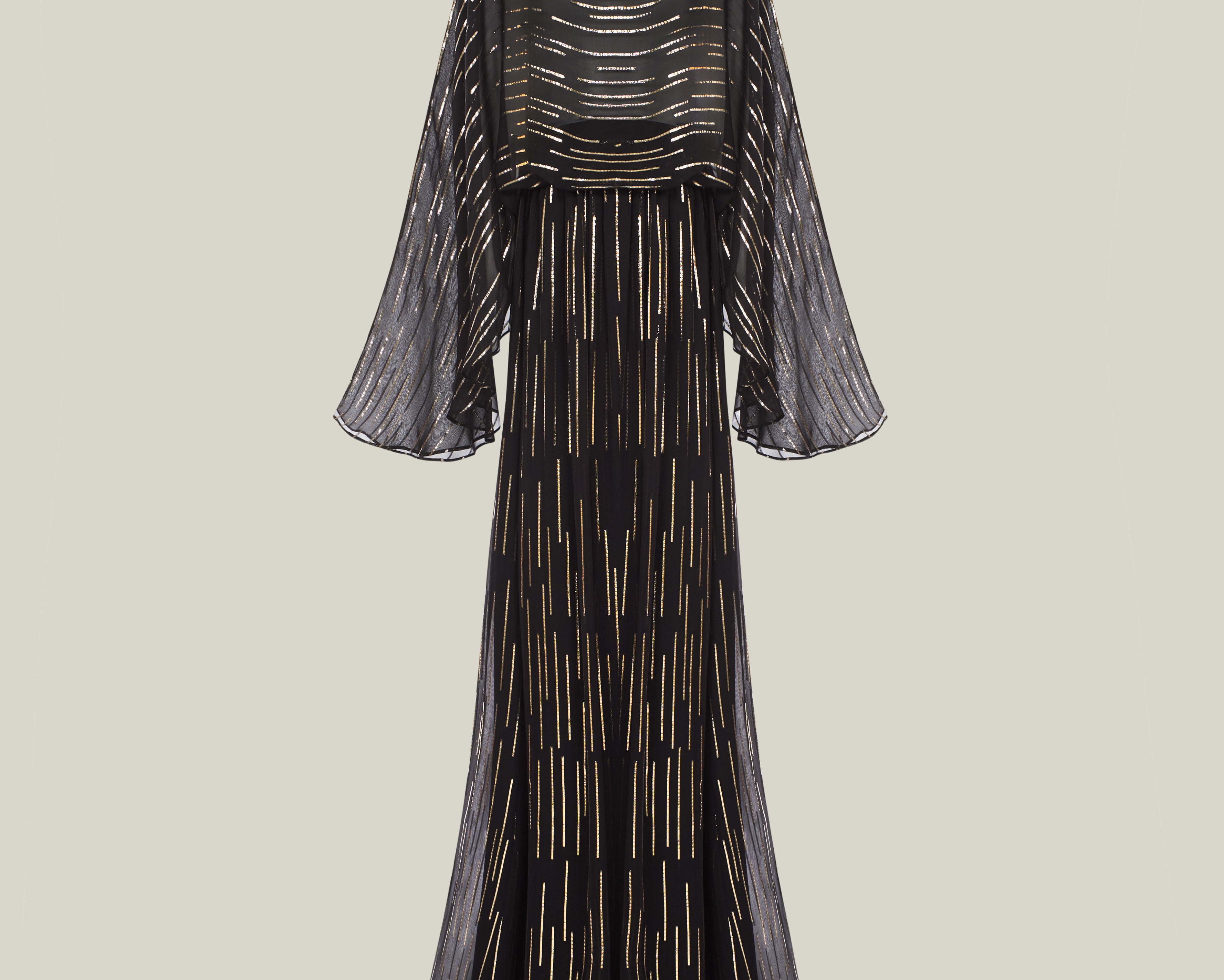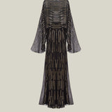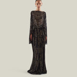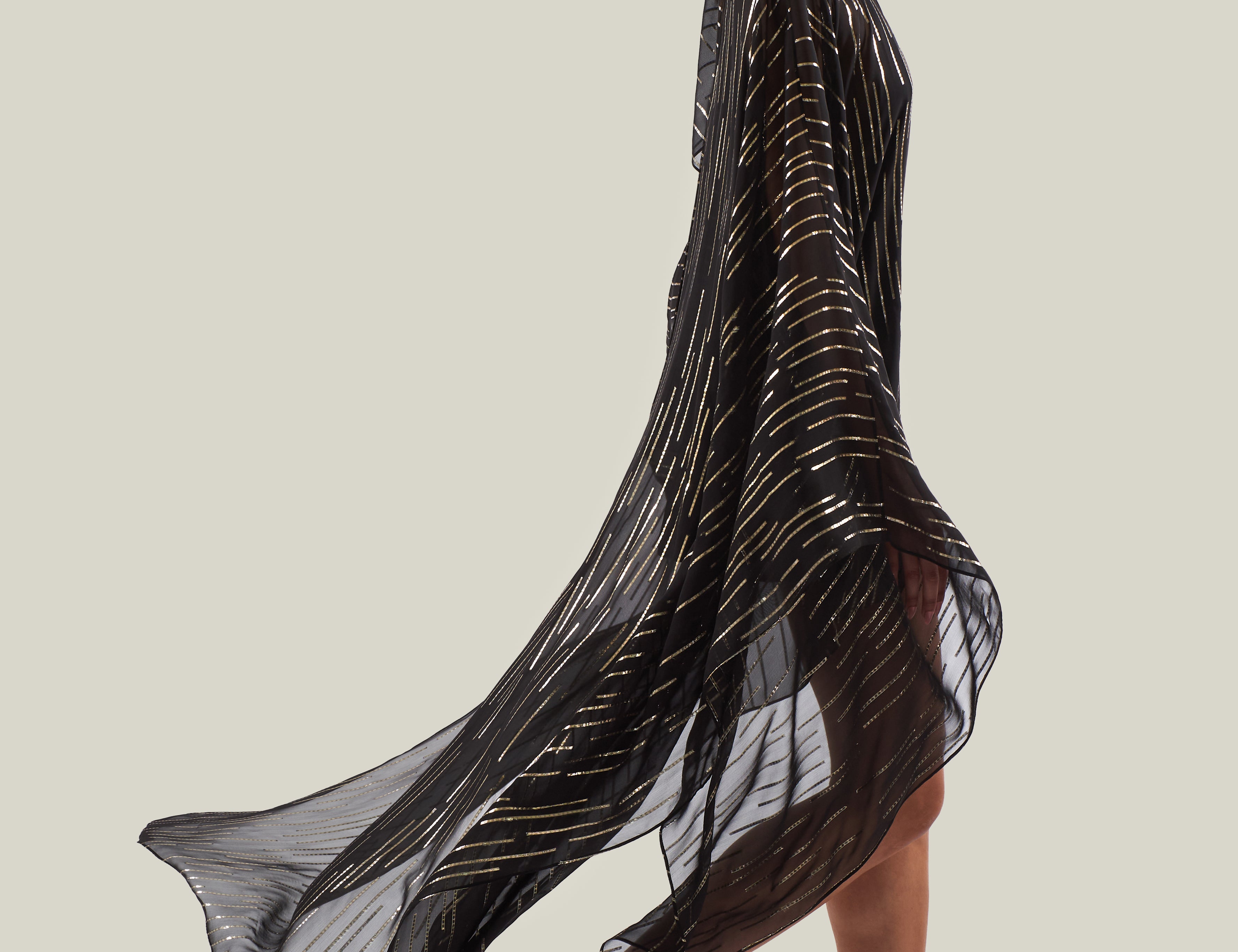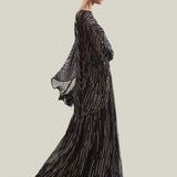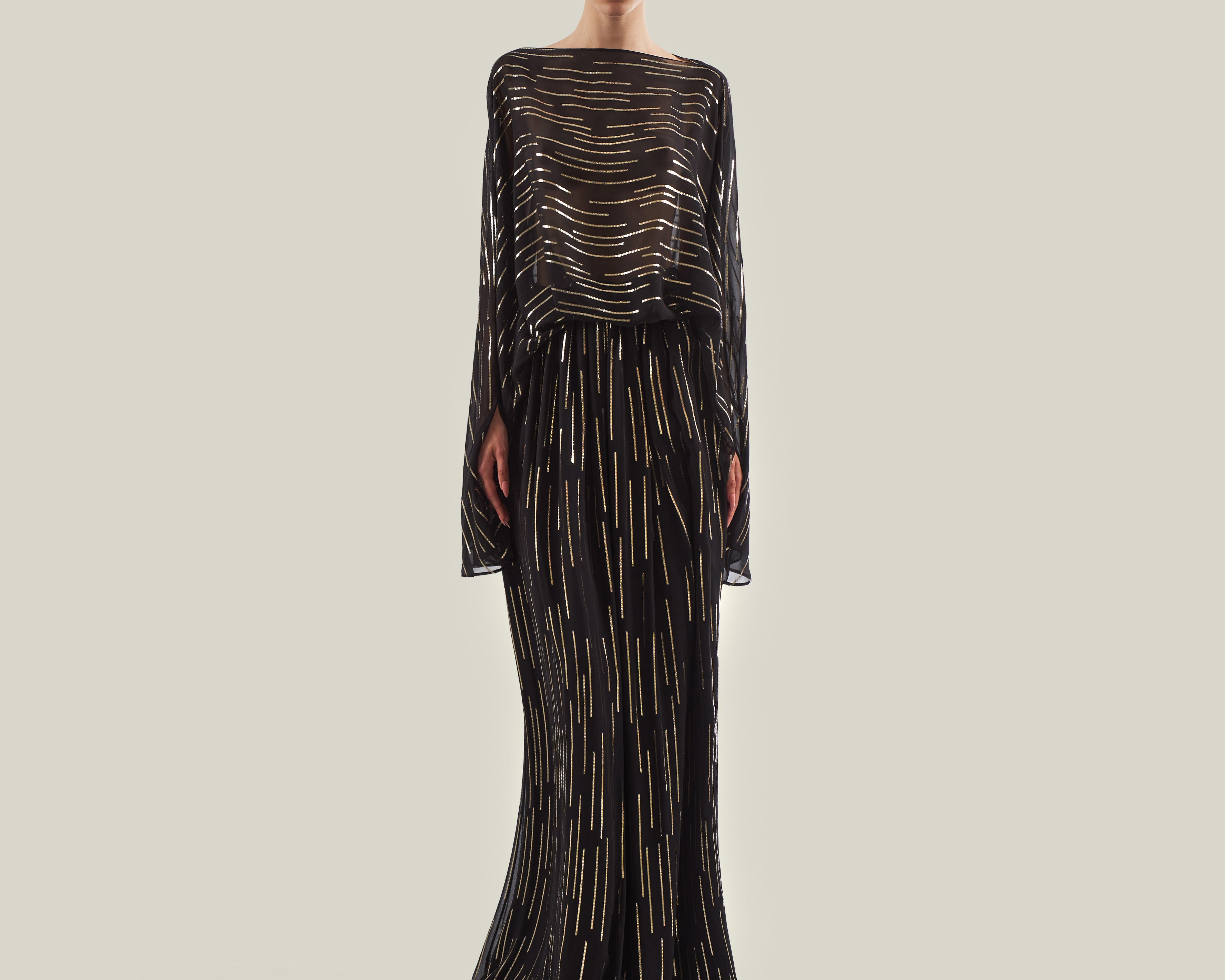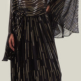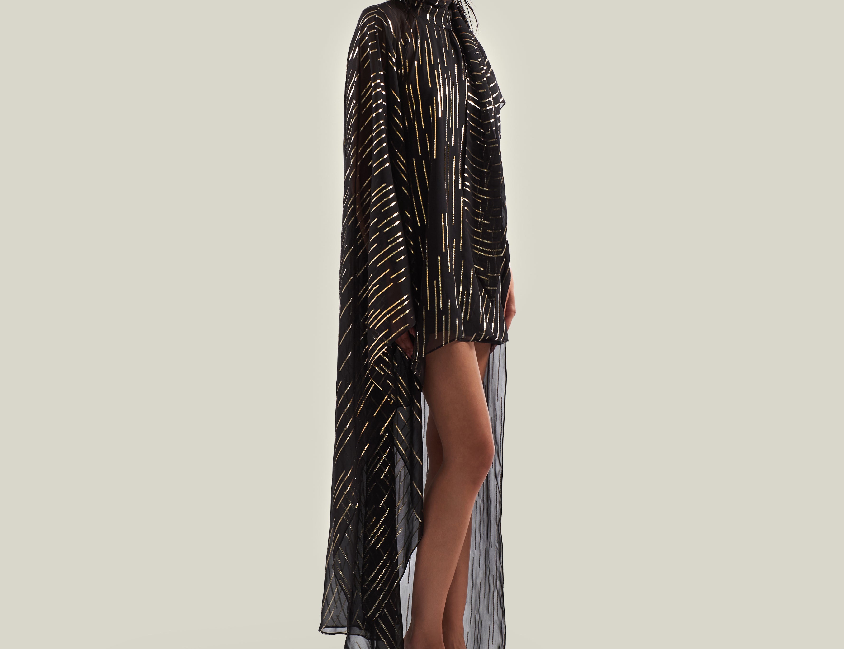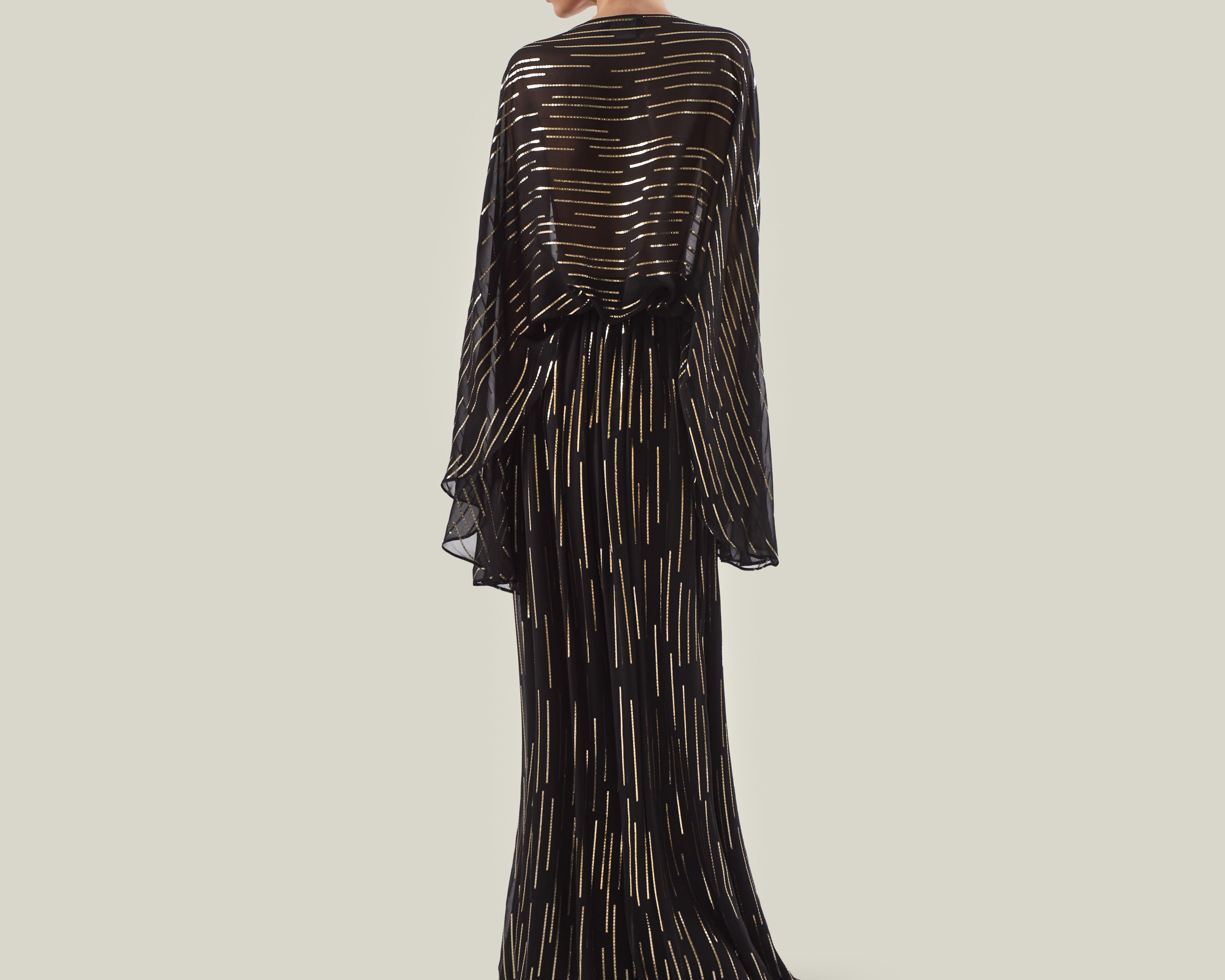 Soft lines and luminous threads define the Tribeca. A blouson dress crafted from lightweight fil coupé. The sheer overlay reveals subtle reflections woven into the fabric, while the maxi skirt flows elegantly with each movement. The relaxed cut and boat neckline enhance its effortless grace, balancing structure and fluidity.