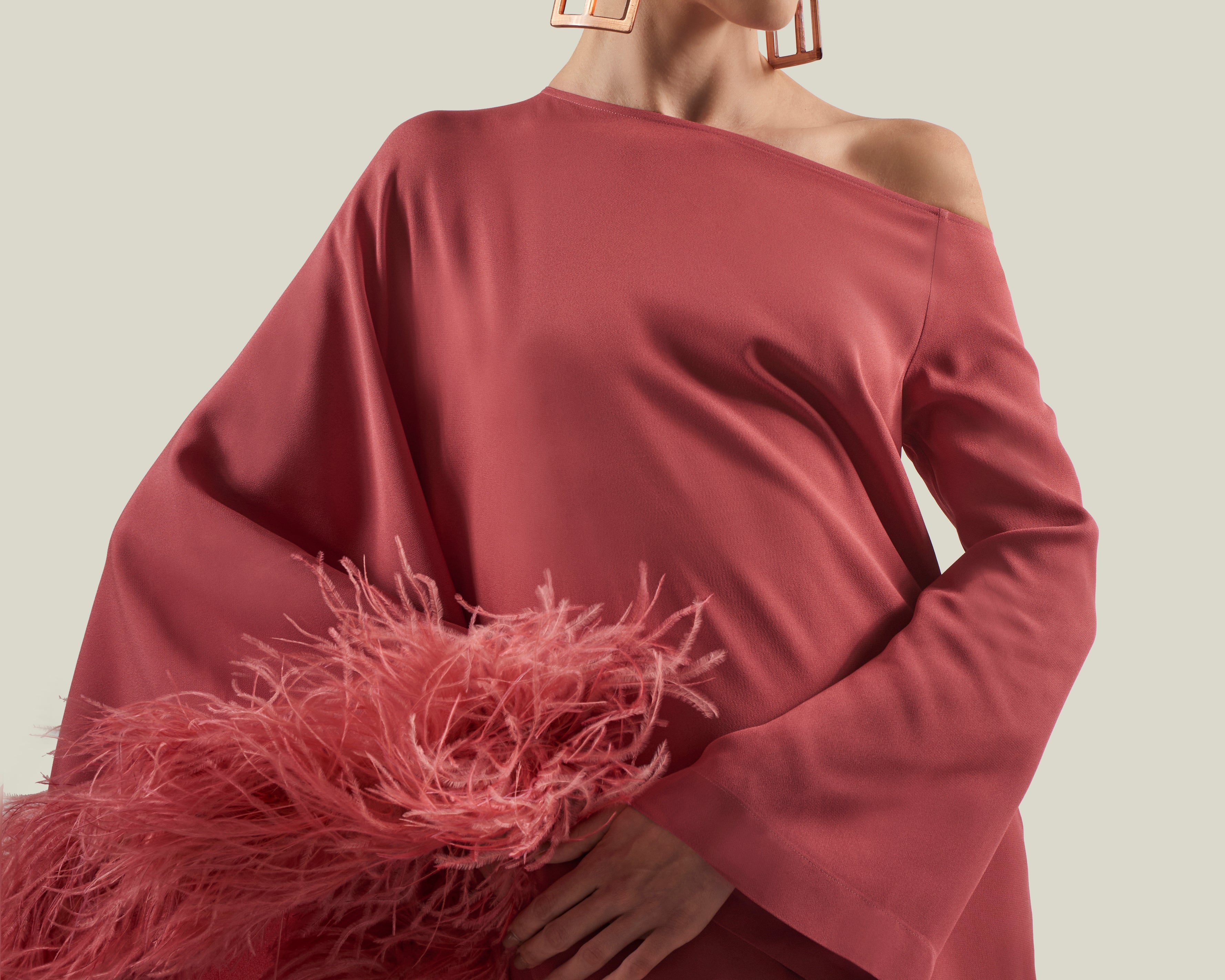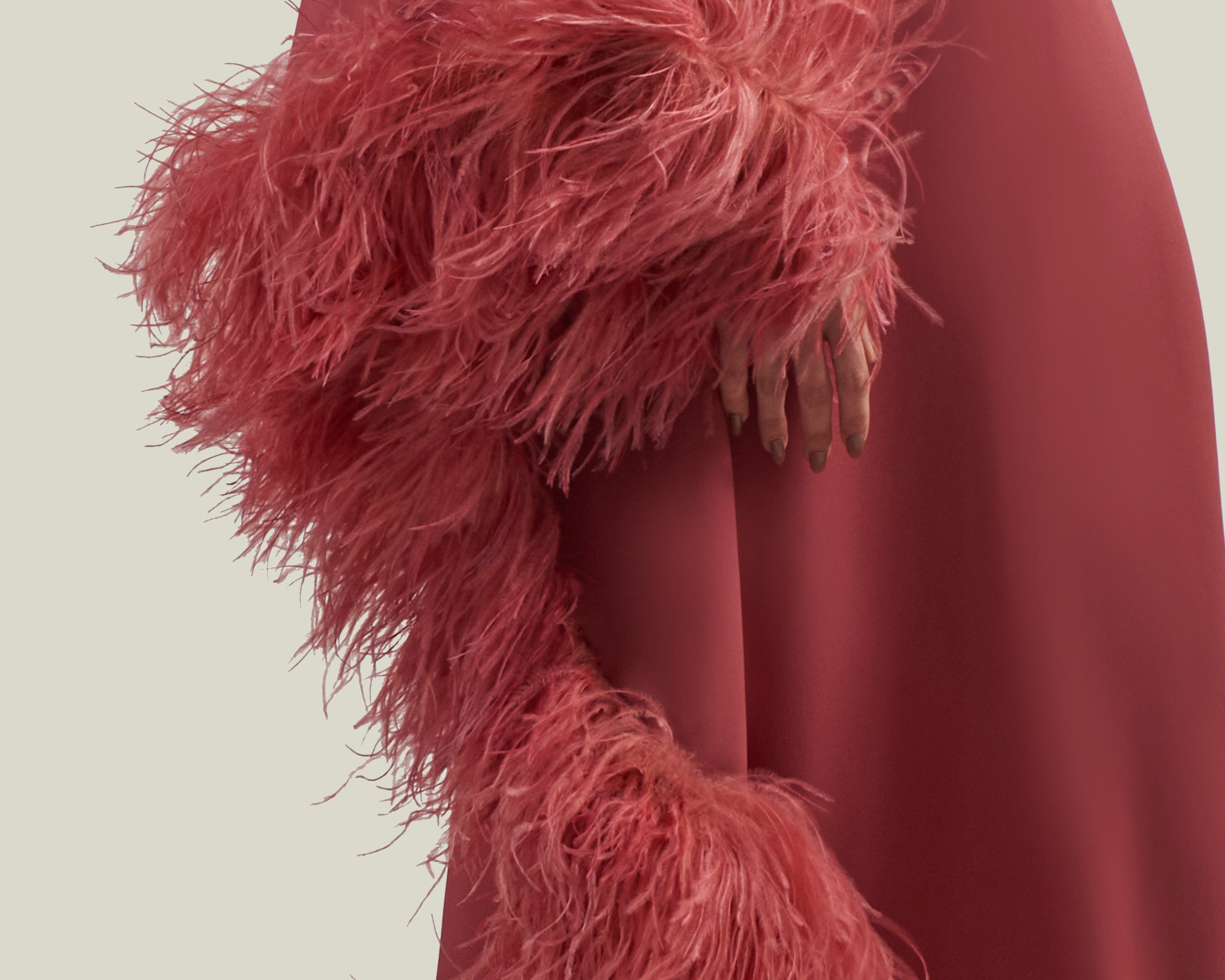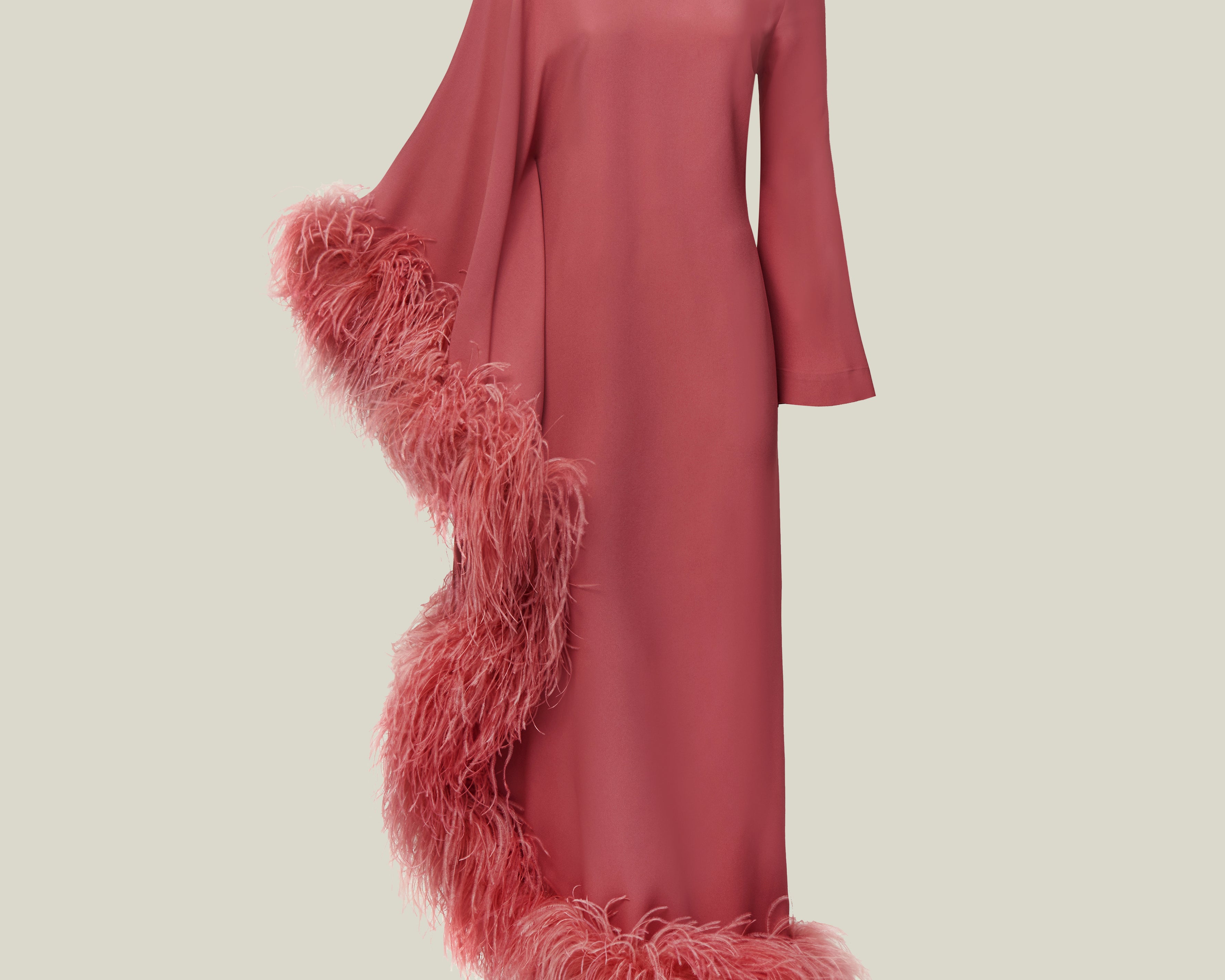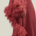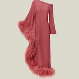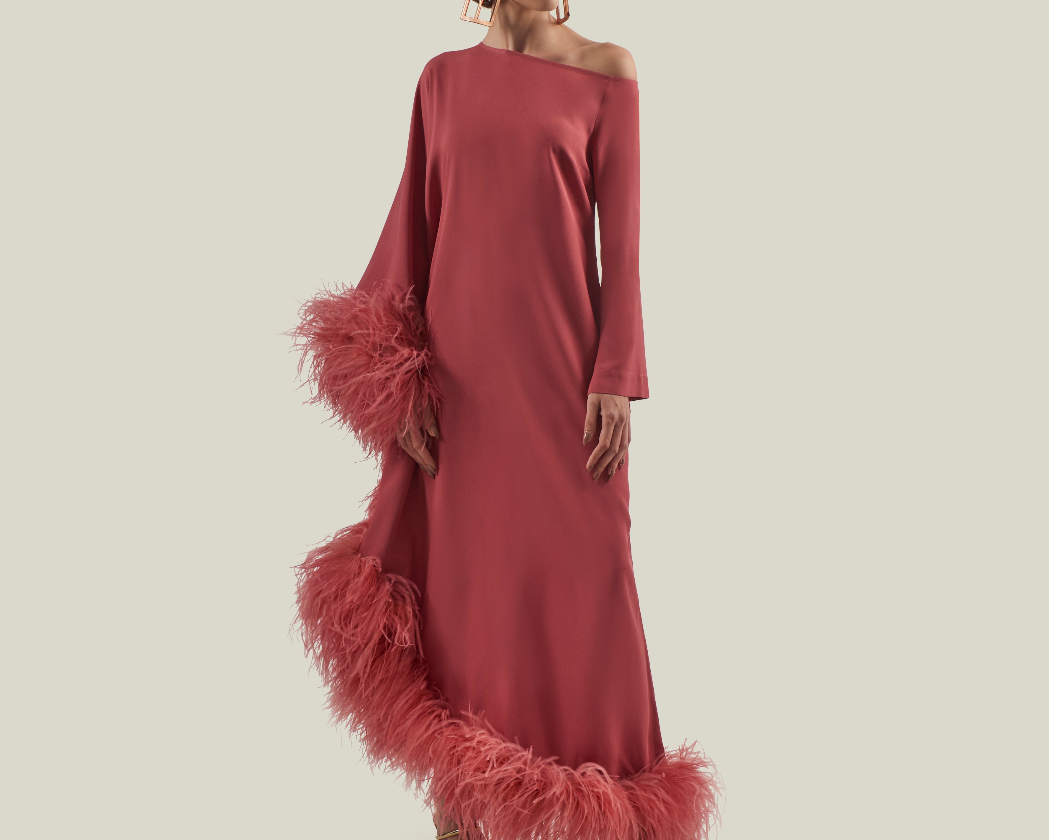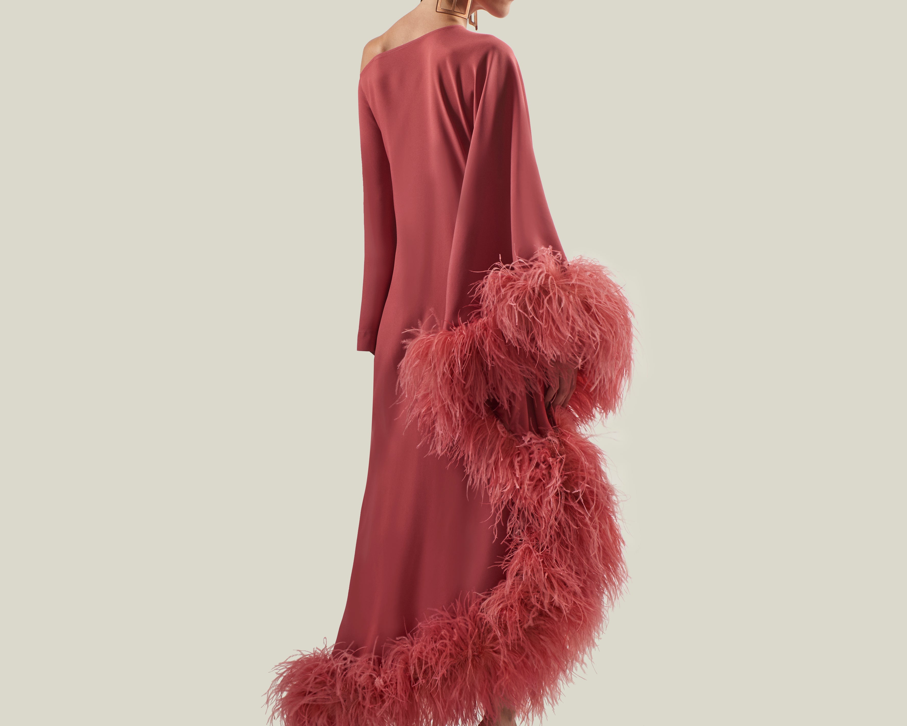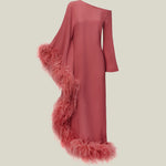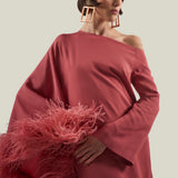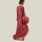 A Taller Marmo Classic, the Ubud Dress Extravaganza is a cold-shoulder maxi dress with a relaxed fit, made from soft viscose-blend crepe cady, and fully trimmed with a luxurious soft boa of ostrich feathers.