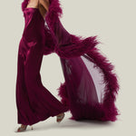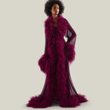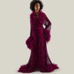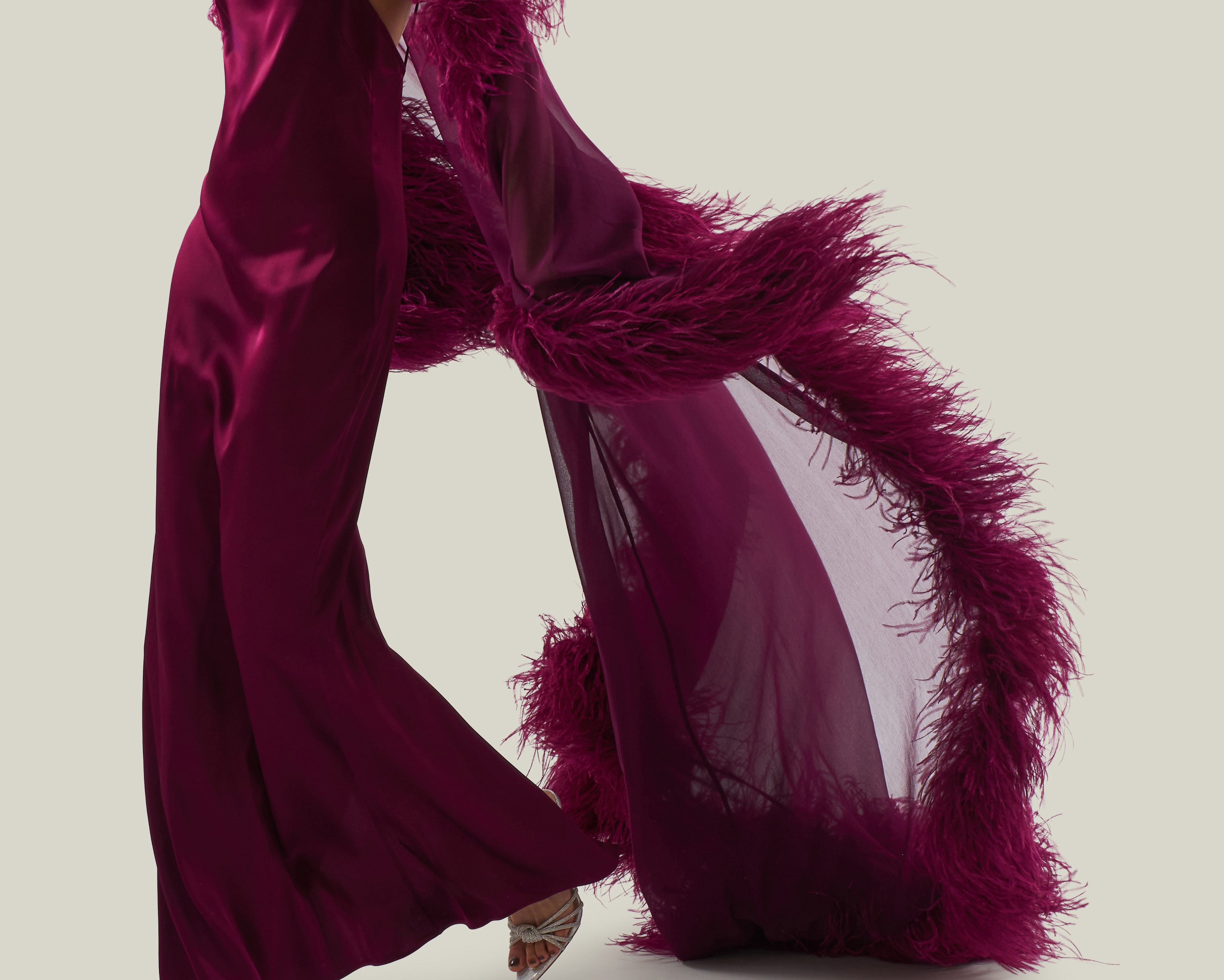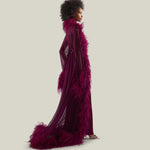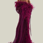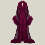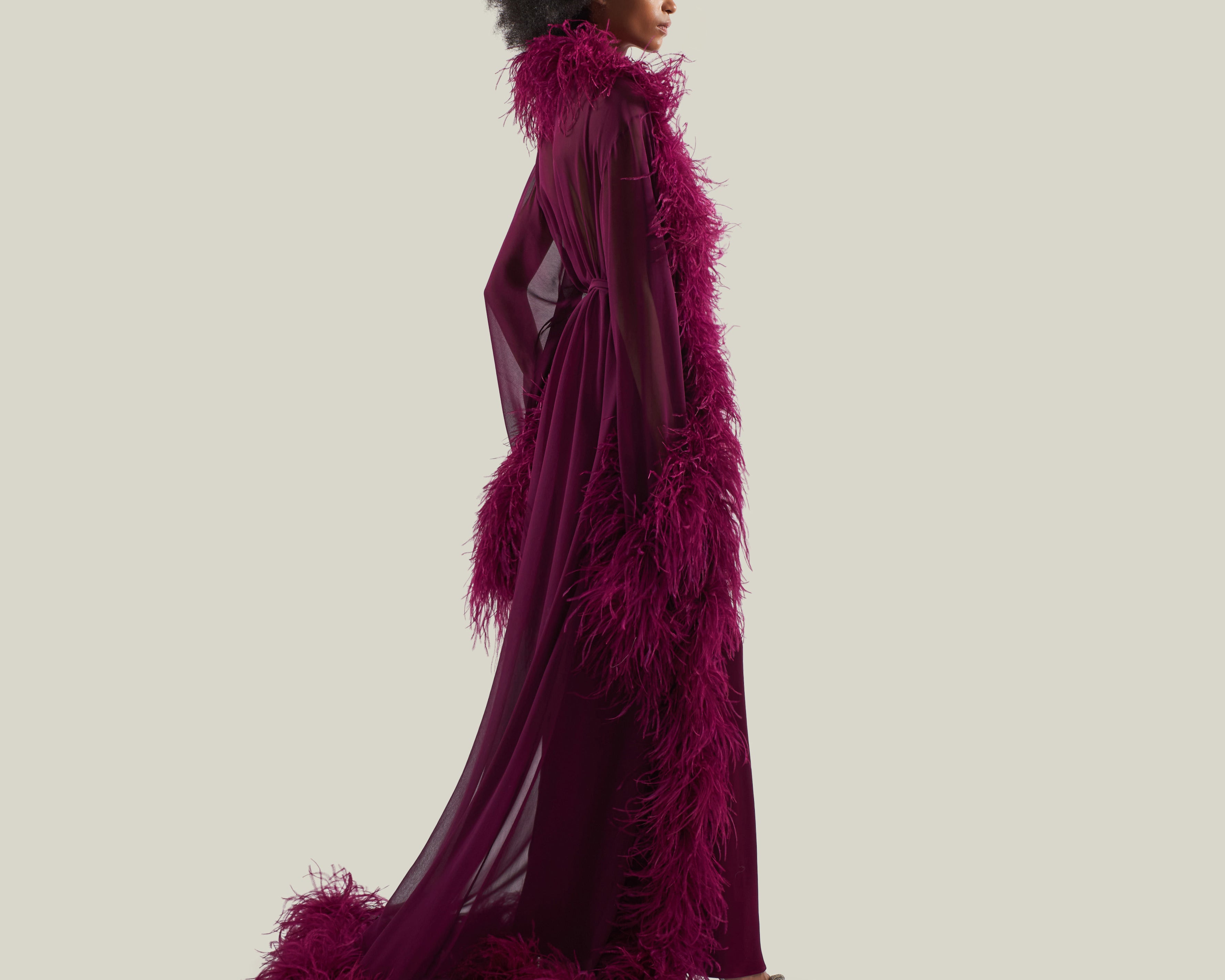 A timeless icon of sensual elegance. The Vedette is a long-sleeve night robe made from the softest silk chiffon, fully trimmed with almost 9 meters of airy ostrich feathers cascade. It features a matching belt with loops to cinch the waist, enhancing your silhouette, and a detached tonal crepe cady slip dress. Envelop yourself in sheer luxury and sophistication.