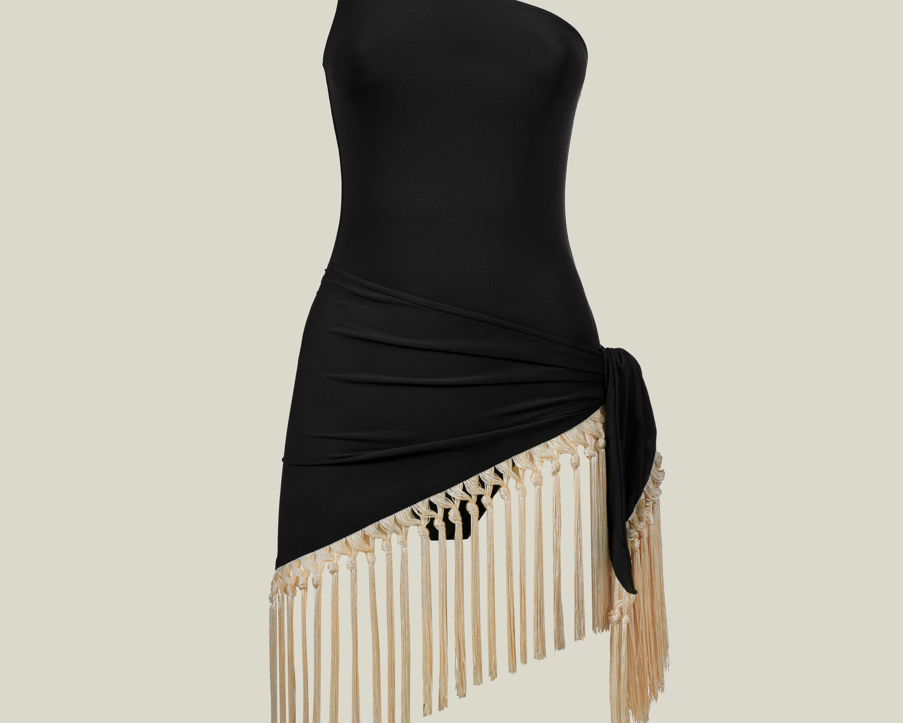 The Yacare is a sleek one-shoulder swimsuit crafted from soft jersey, paired with a detachable pareo for versatile styling. The pareo matches the swimsuit’s color and is adorned with hand-tied contrast ivory fringes, adding movement and texture. Perfect for the beach or glamorous summer soirées.