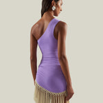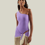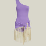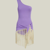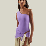 One shoulder swimsuit and dettached hand-tied fringe-trimmed short pareo set