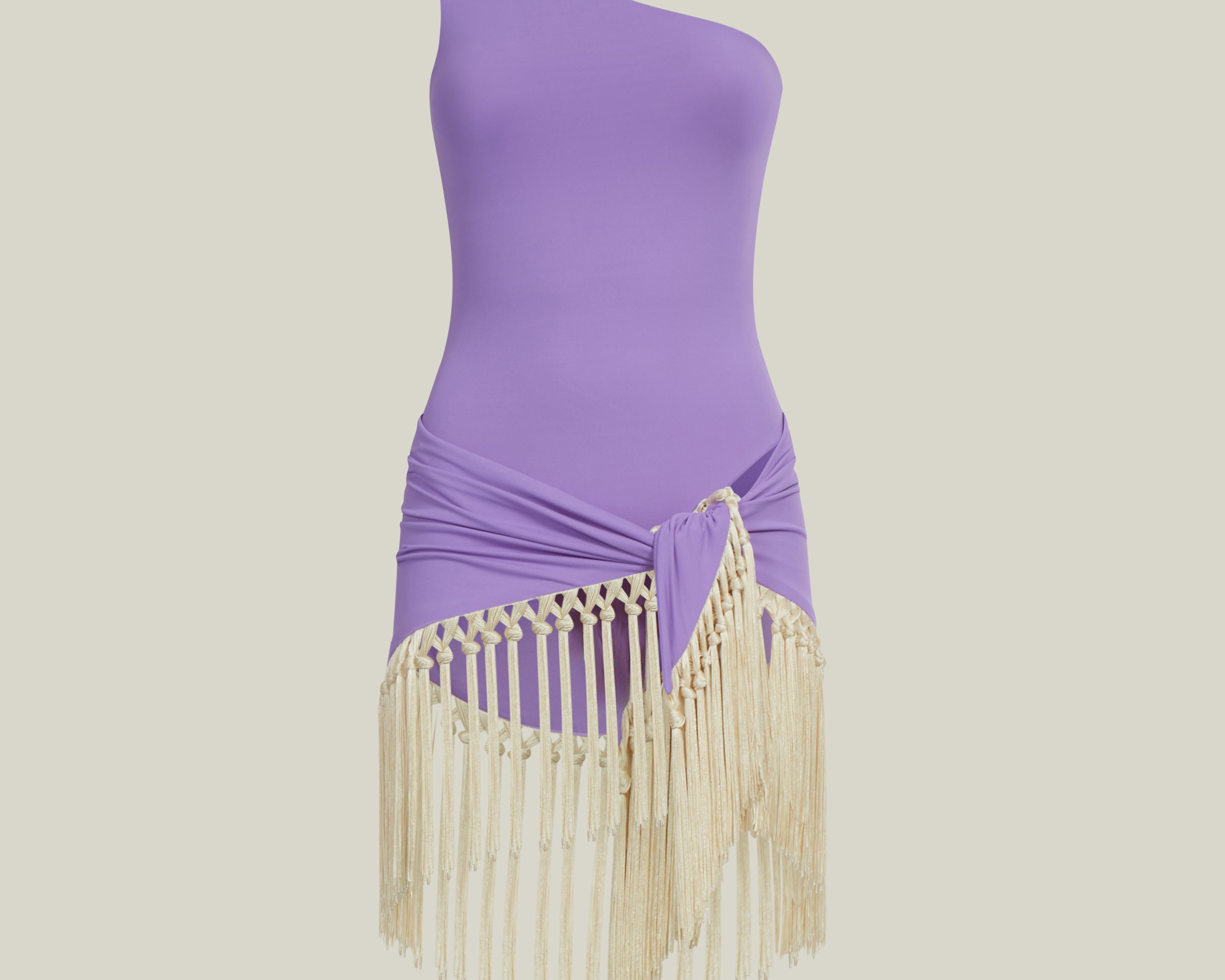 The Yacare is a sleek one-shoulder swimsuit crafted from soft jersey, paired with a detachable pareo for versatile styling. The pareo matches the swimsuit’s color and is adorned with hand-tied contrast ivory fringes, adding movement and texture. Perfect for the beach or glamorous summer soirées.