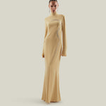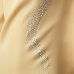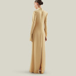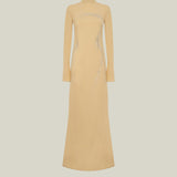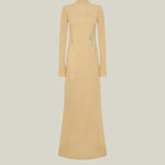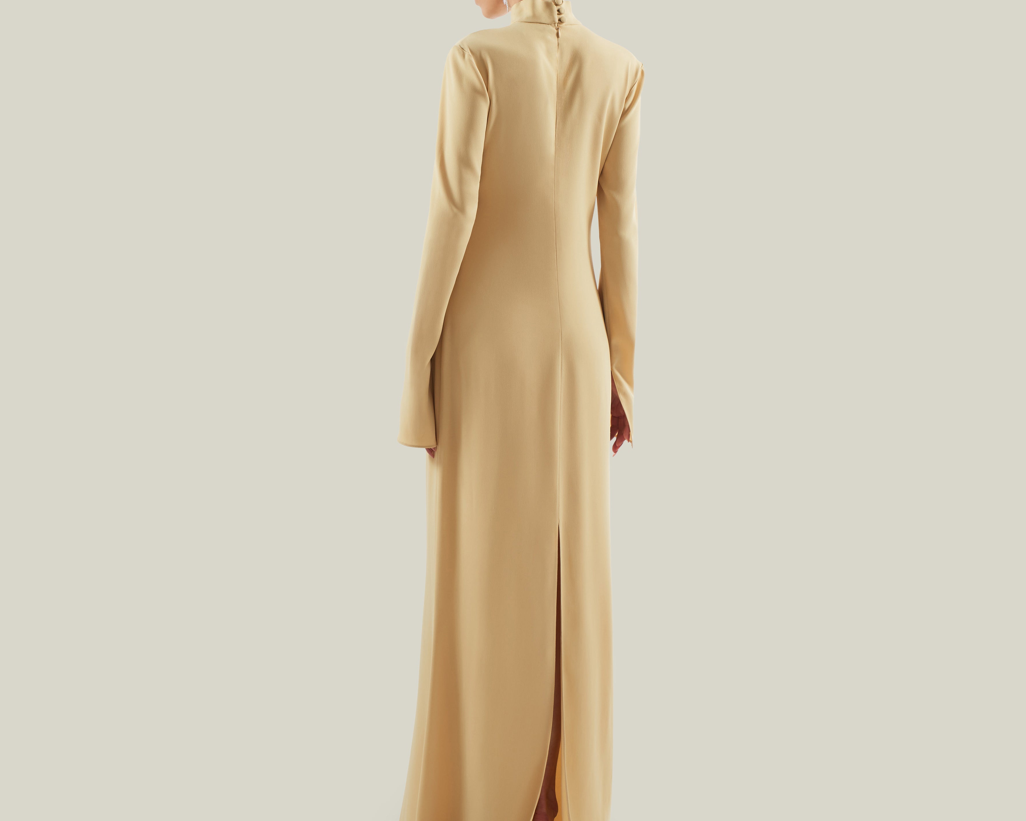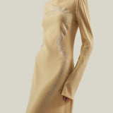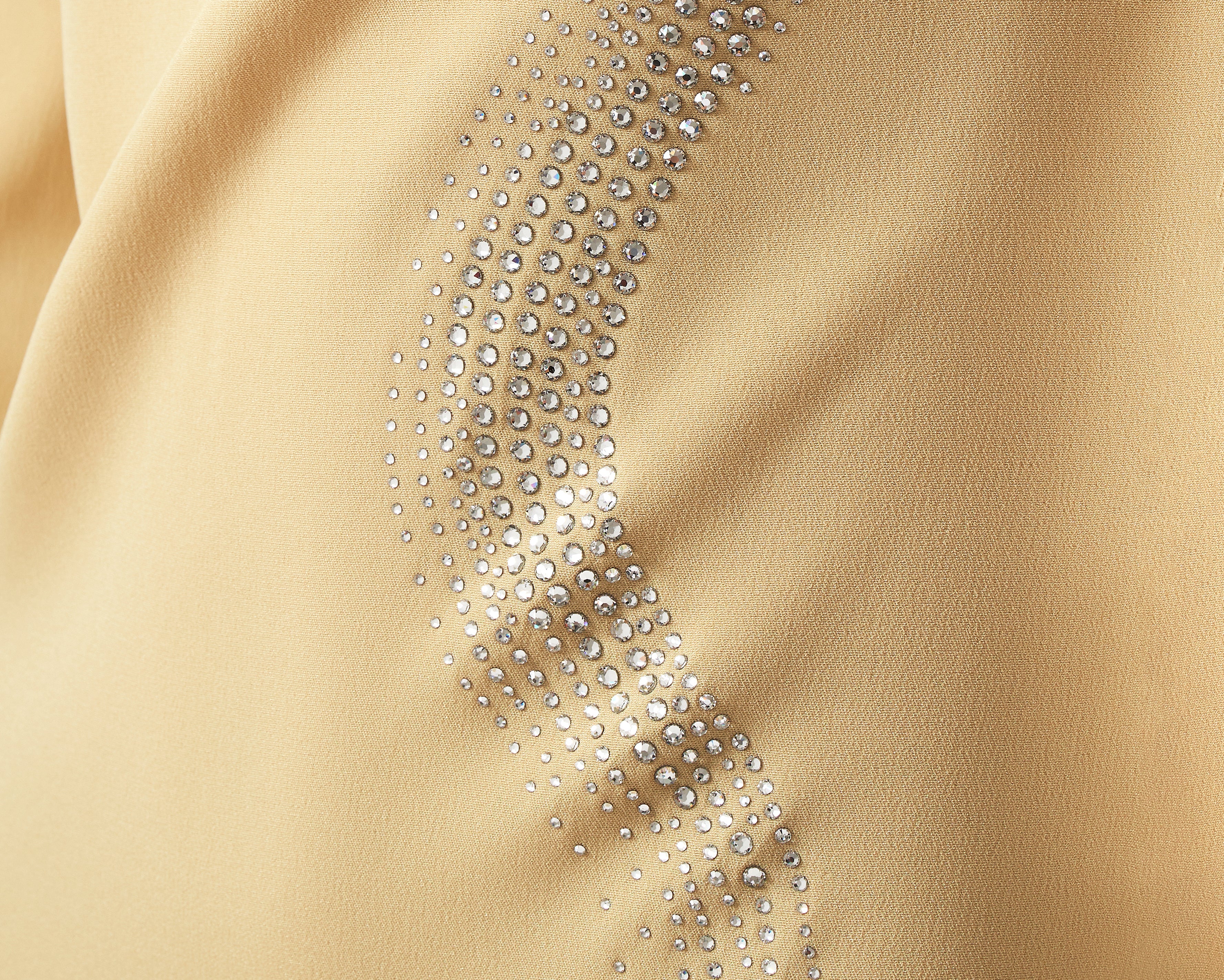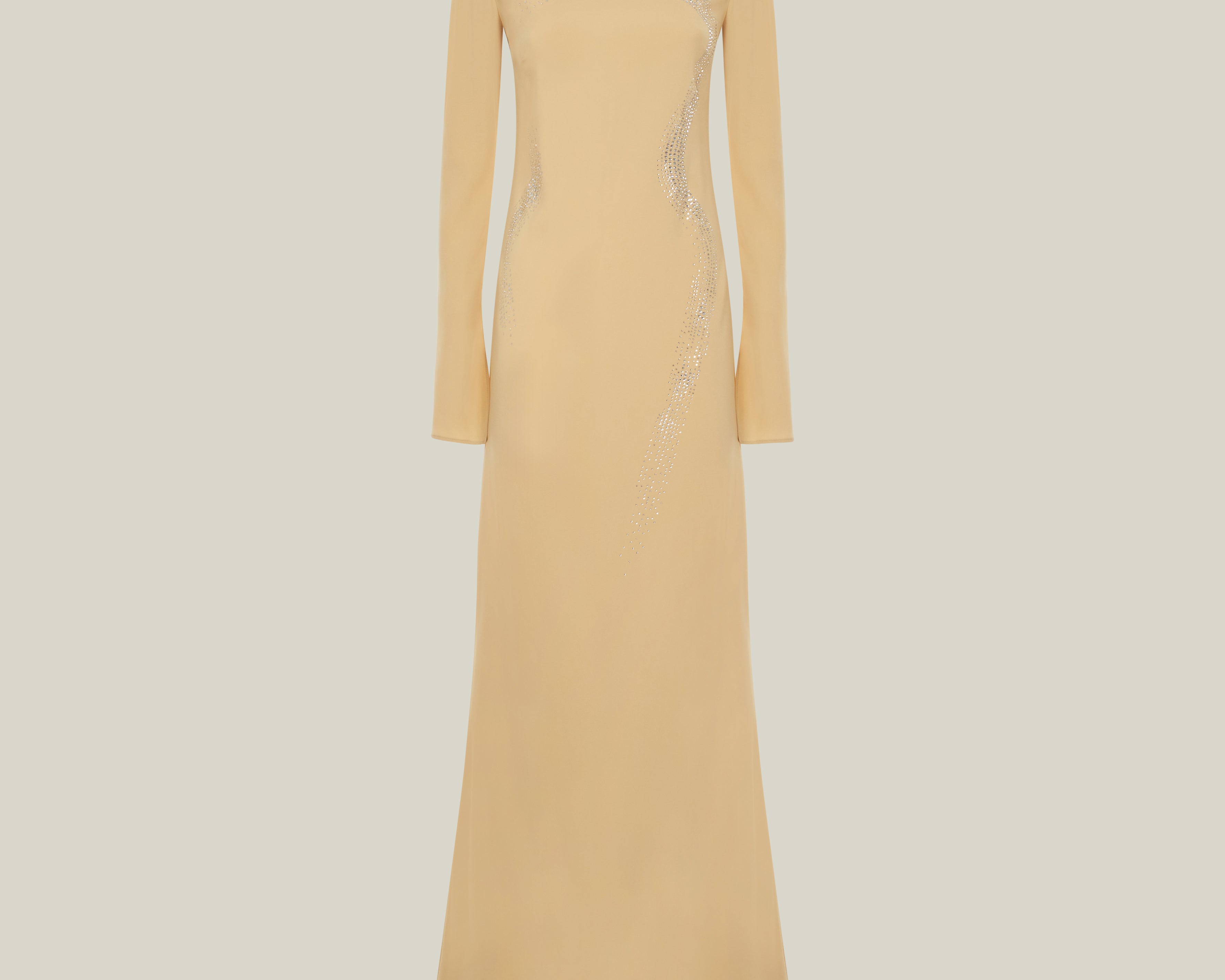 Grace and precision intertwine in the Ziegfeld, a long-sleeved column dress in crepe cady adorned with Swarovski® crystals. The sinuous line of crystals follows the natural curves of the body, enhancing its shape with refined luminosity. A statement of sculptural elegance and understated glamour.