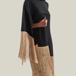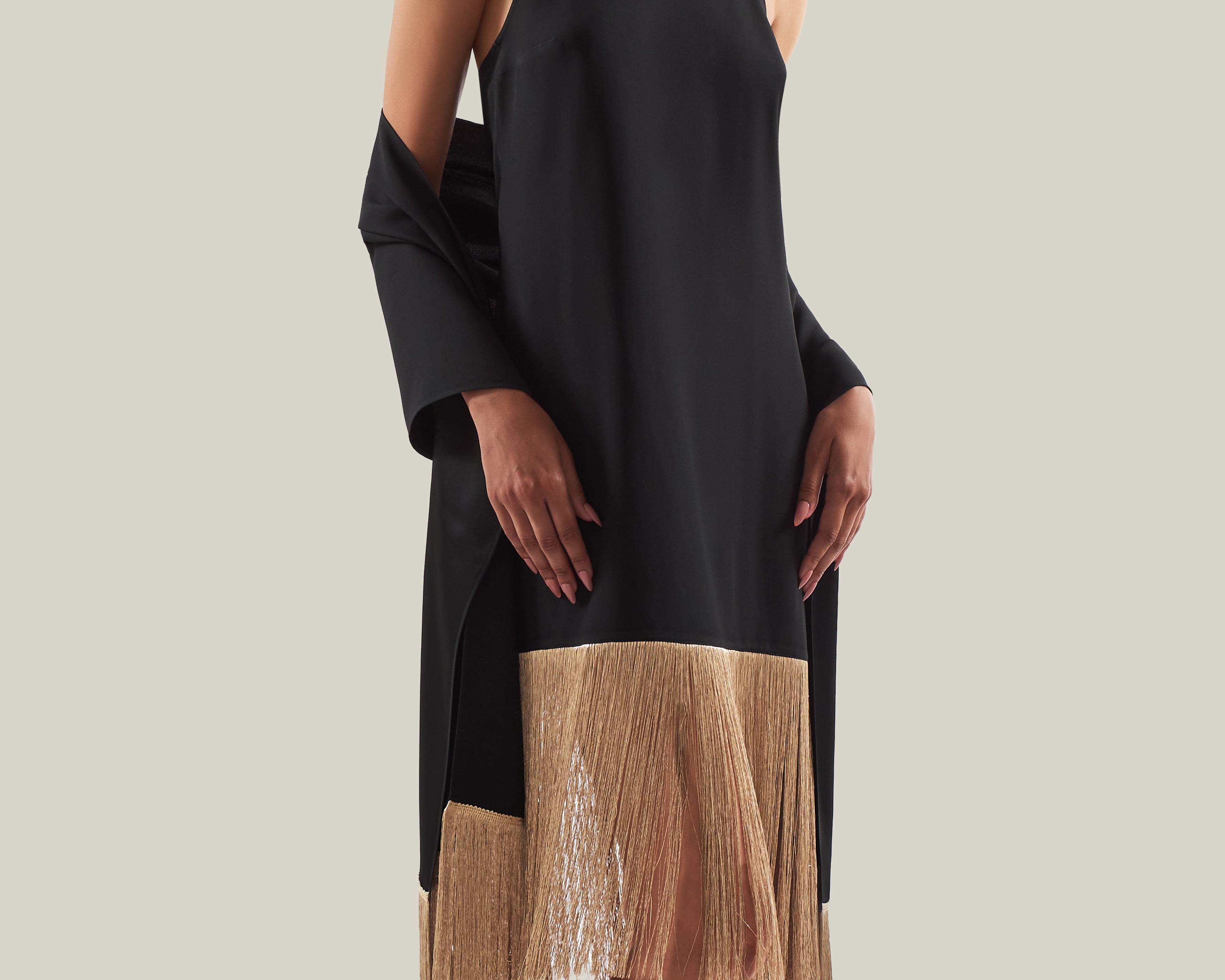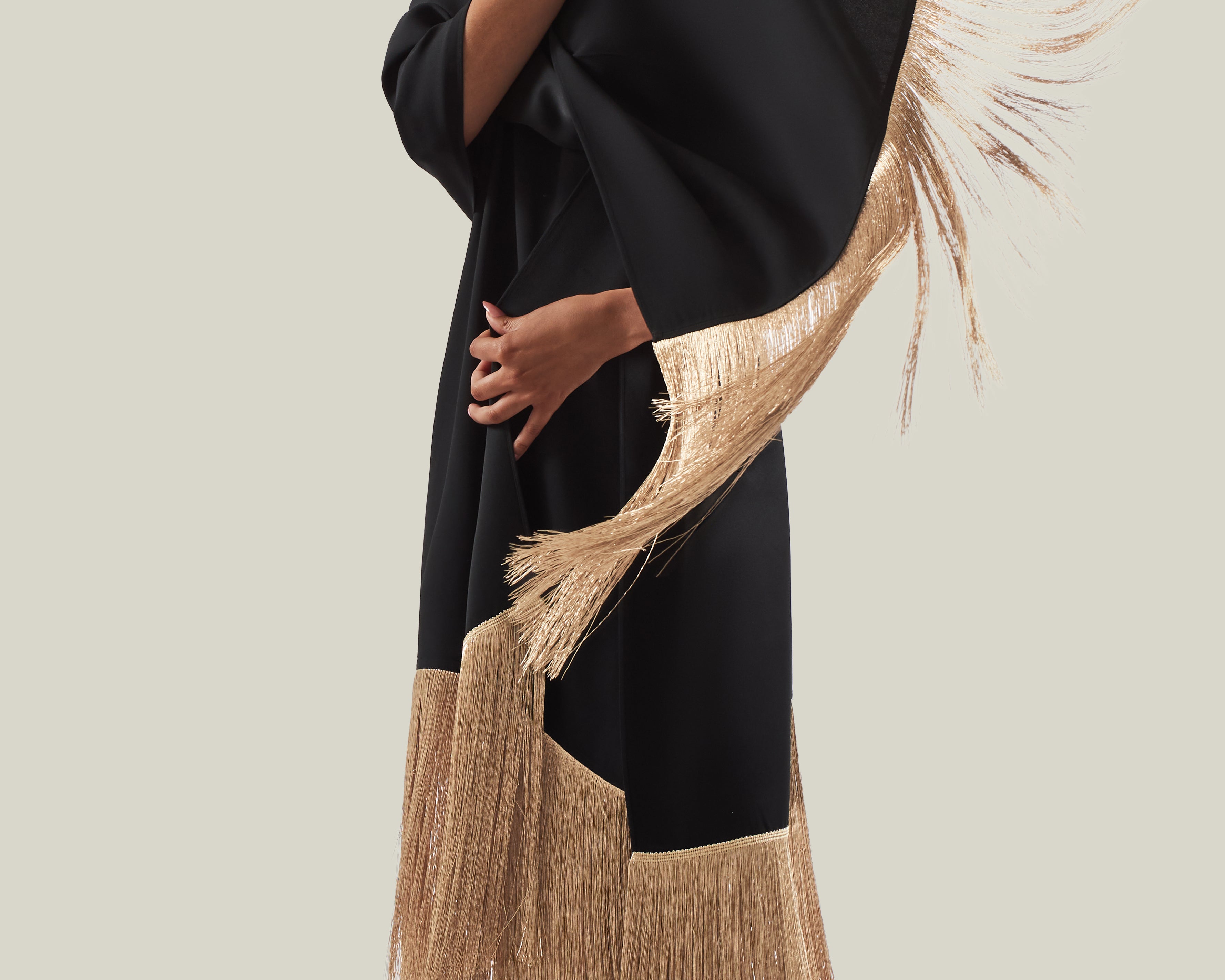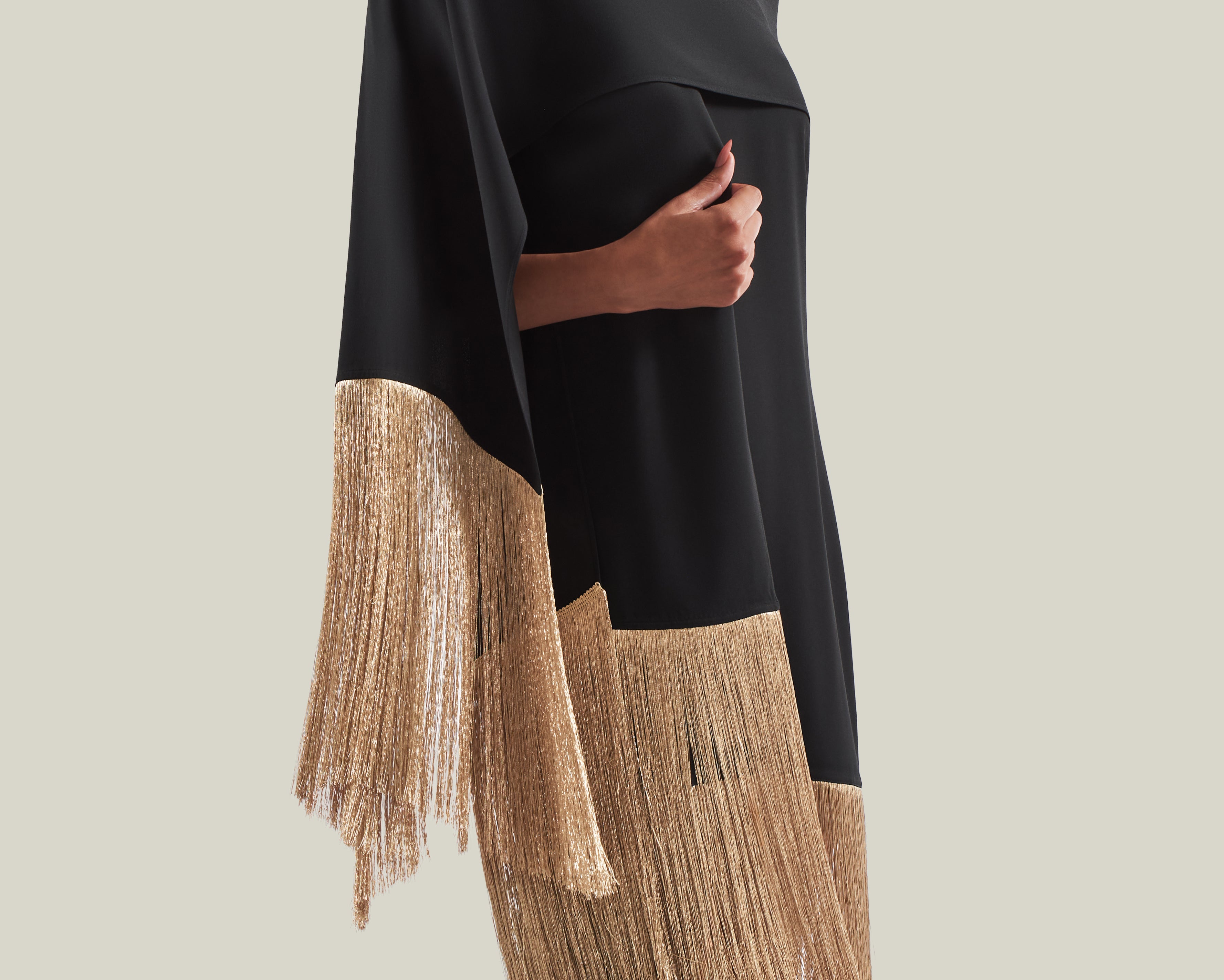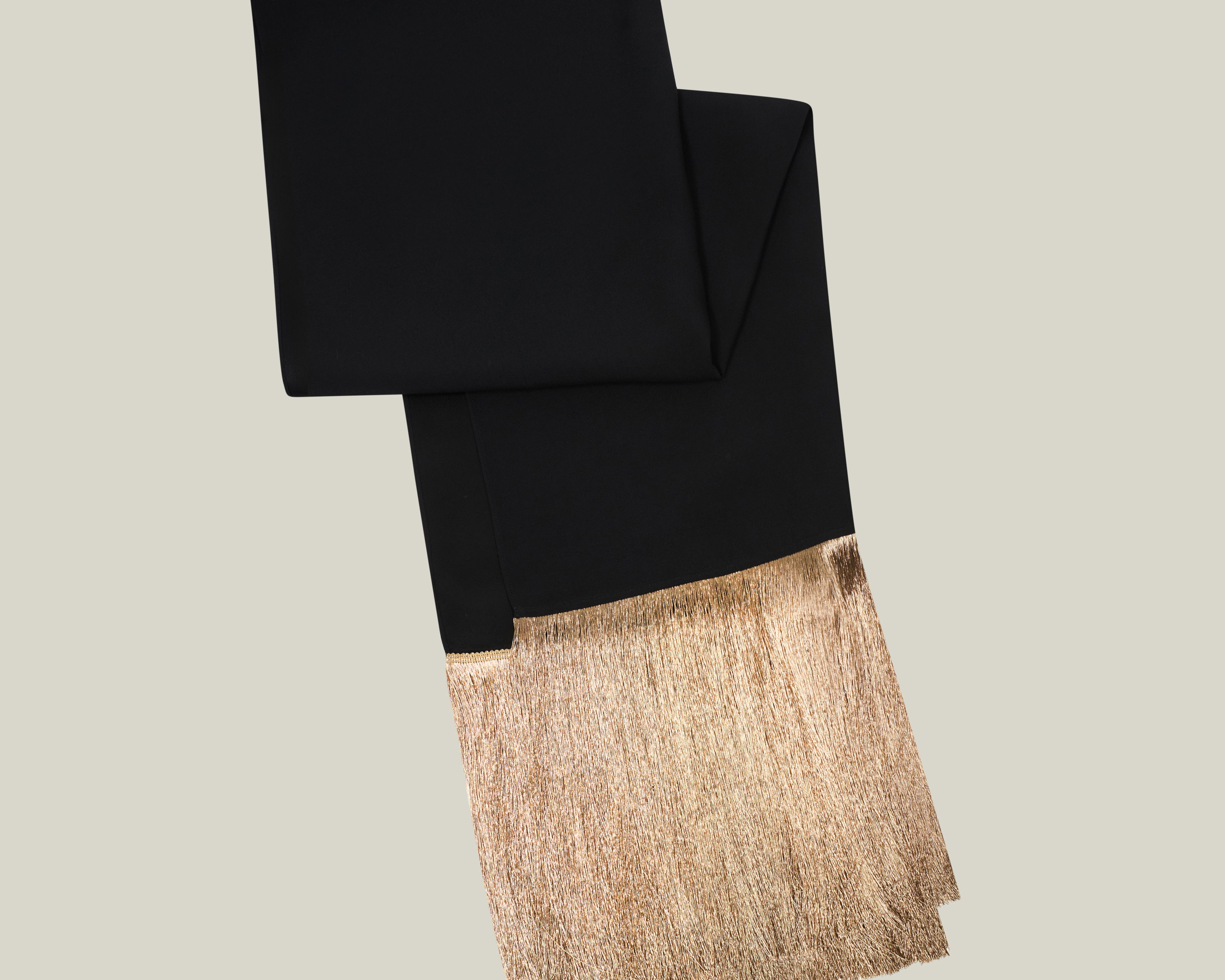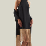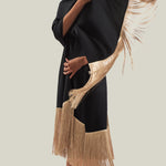 The Zizi Stole is an elegant stole adorned with metallic fringes, designed to complement sleeveless dresses beautifully. Light and versatile, it adds a refined touch to any look.