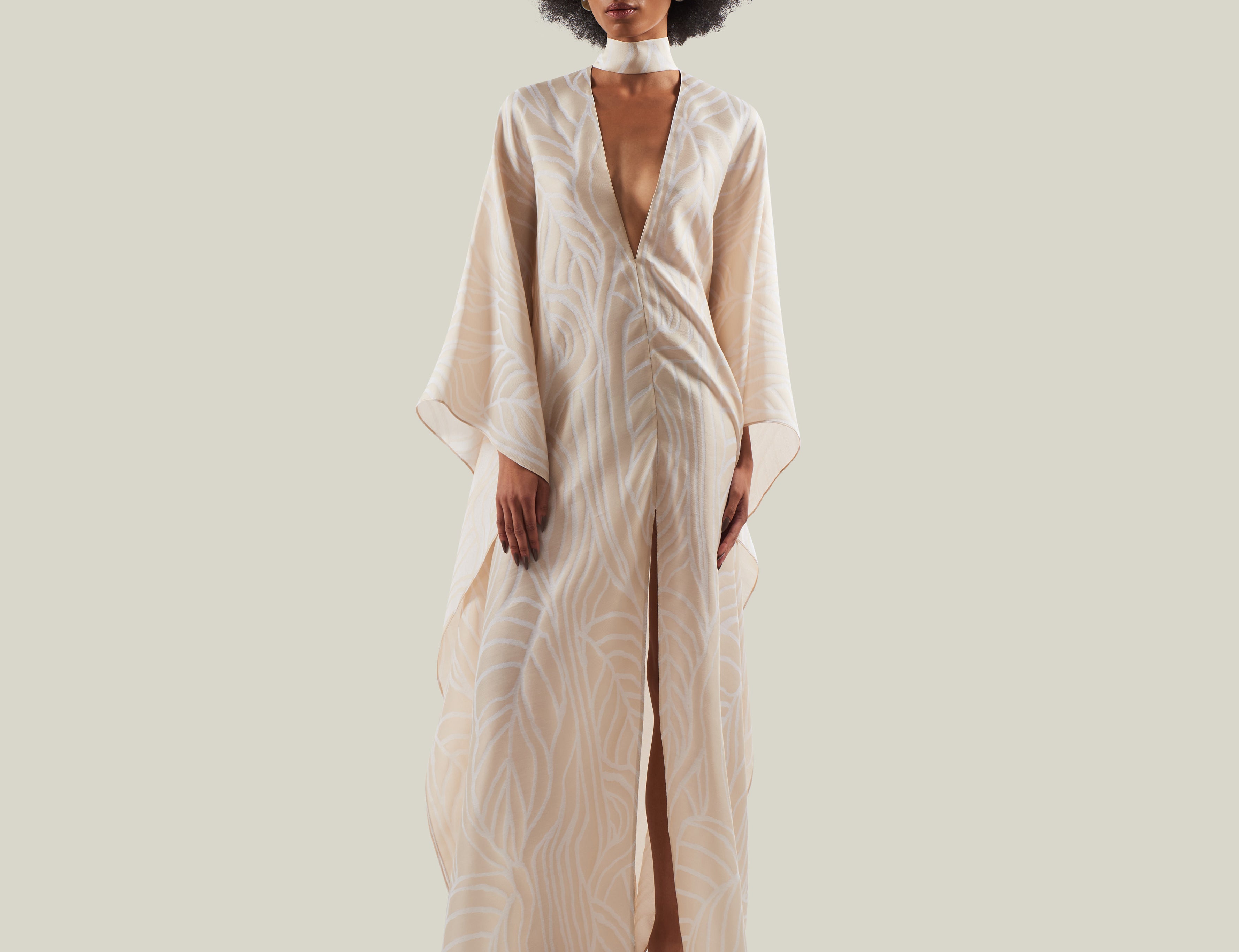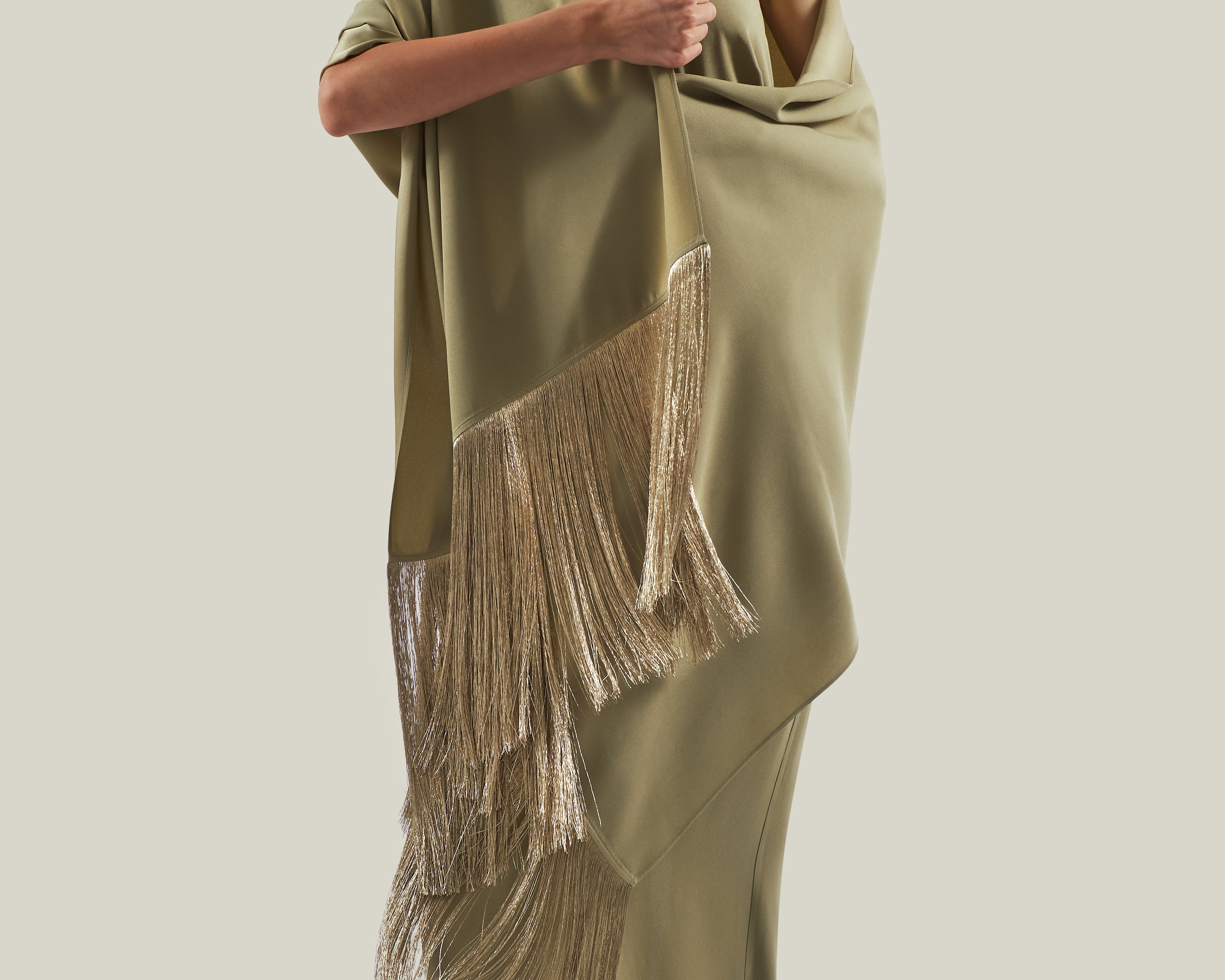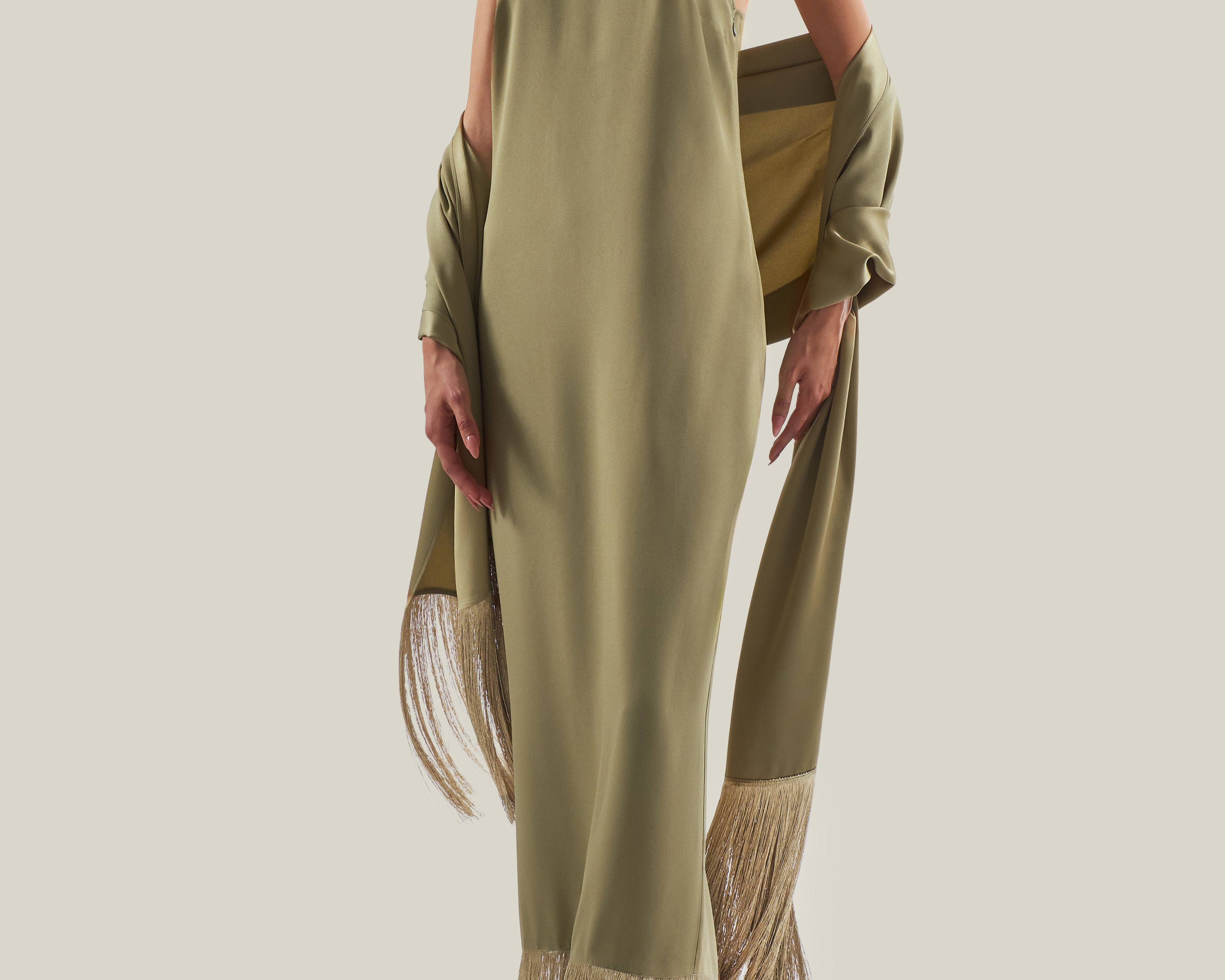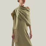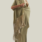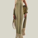 The Zizi Stole is an elegant stole adorned with metallic fringes, designed to complement sleeveless dresses beautifully. Light and versatile, it adds a refined touch to any look.