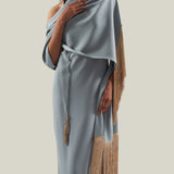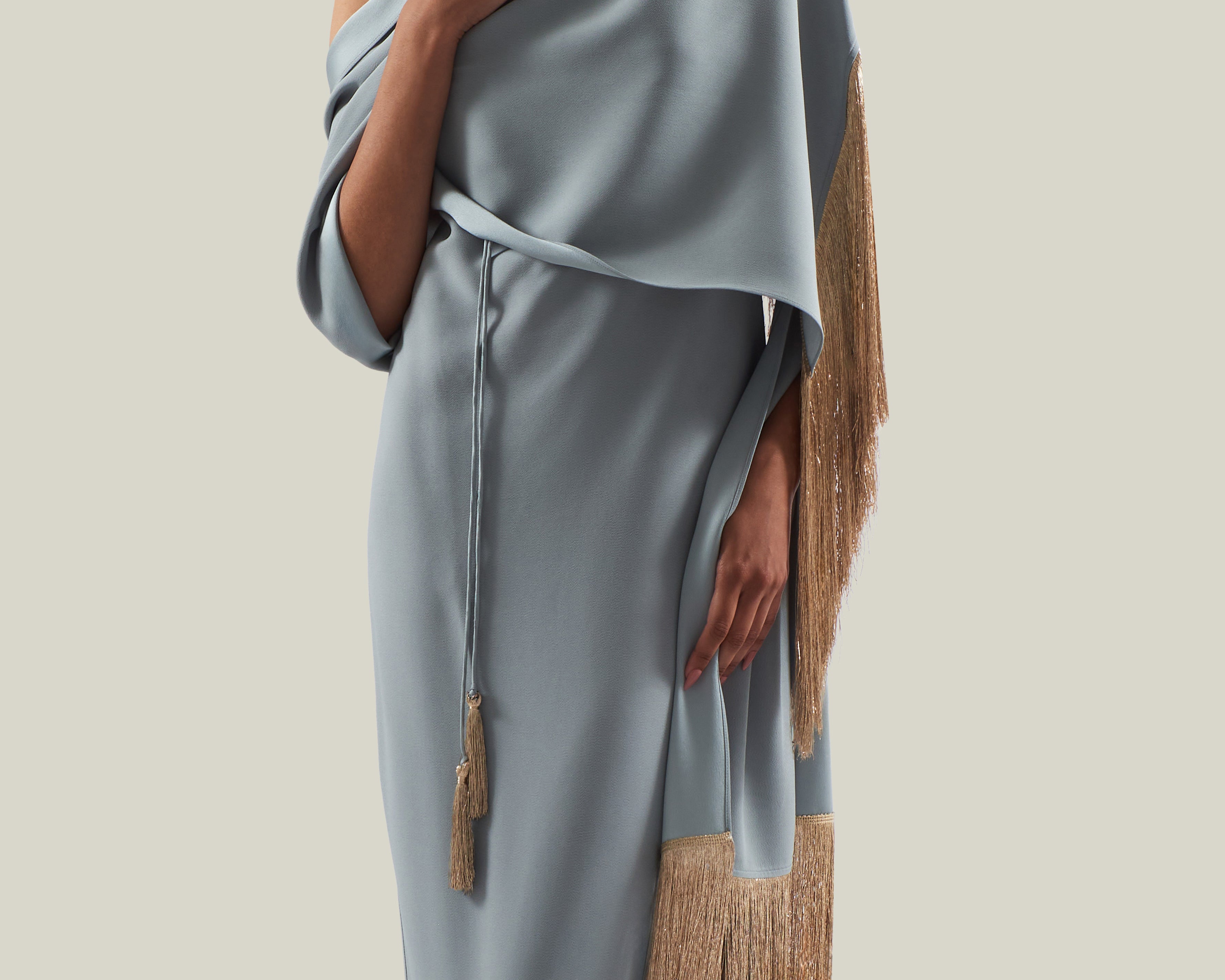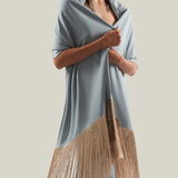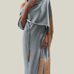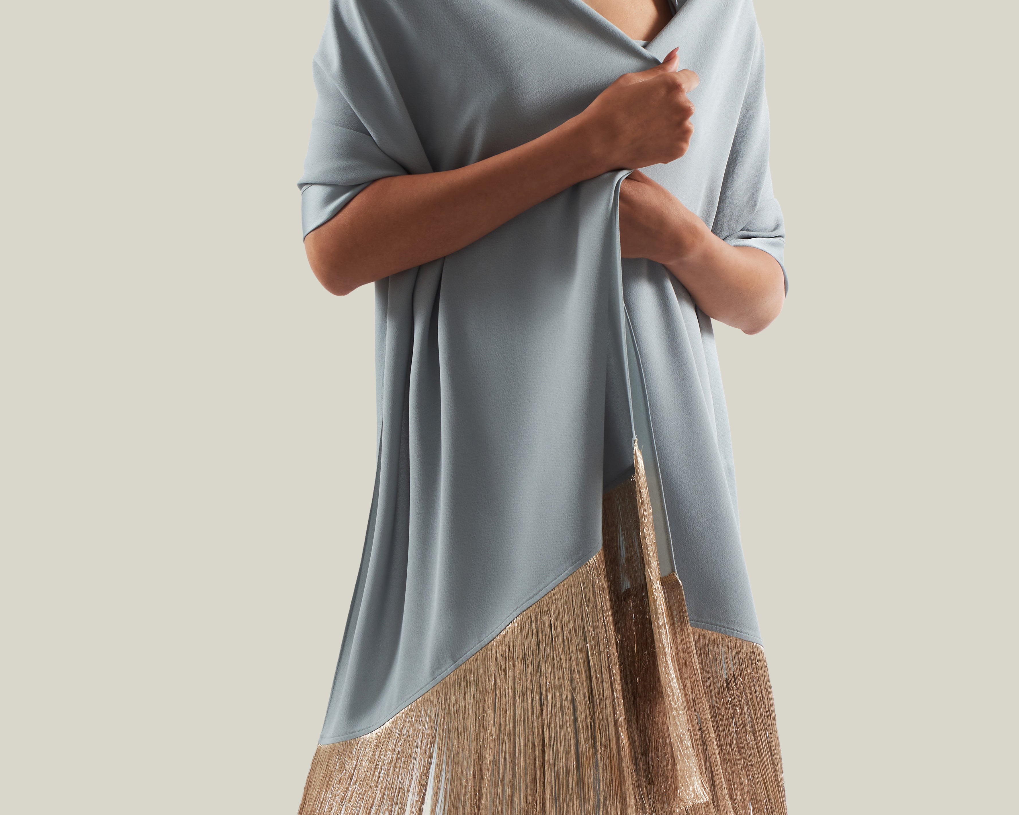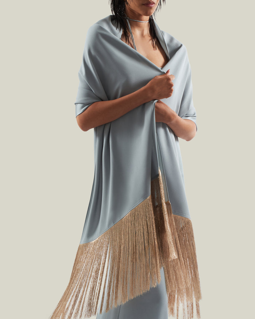 The Zizi Stole is an elegant stole adorned with metallic fringes, designed to complement sleeveless dresses beautifully. Light and versatile, it adds a refined touch to any look.